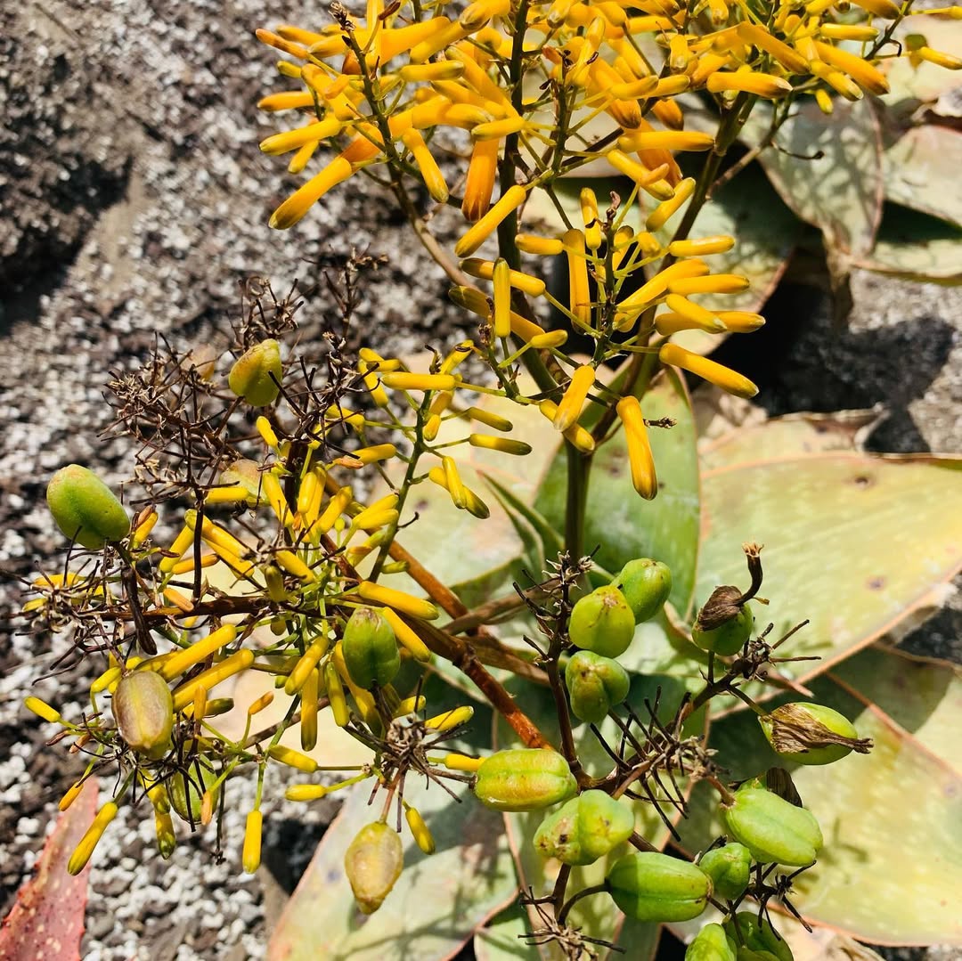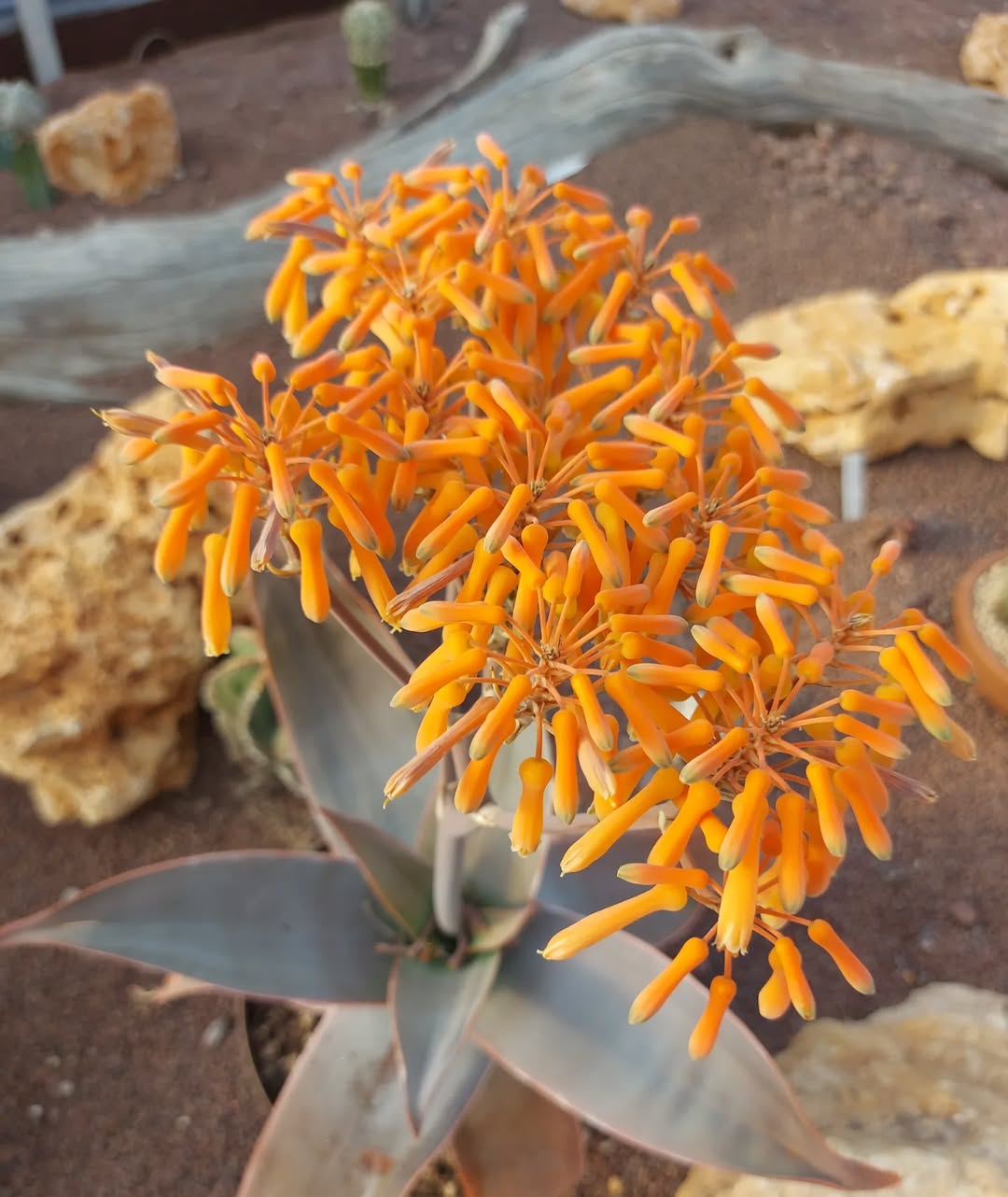 花朵:管状黄色至橙黄色花,基部略膨大,是判断该种与近缘种(如 Aloe striata)的关键性状之一。