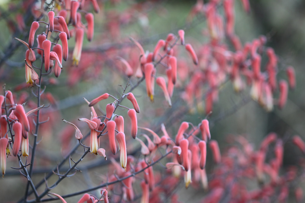 花朵:花朵管状,颜色由黄绿色到粉色**,花梗约 2–3 cm 长。花长约 28–32 mm,外形略呈弯曲状,花瓣先端略分叉。