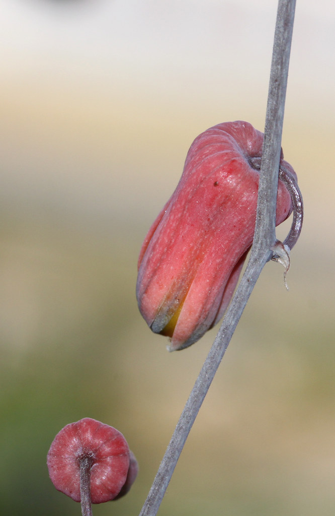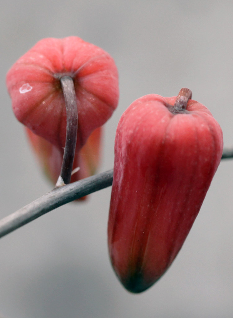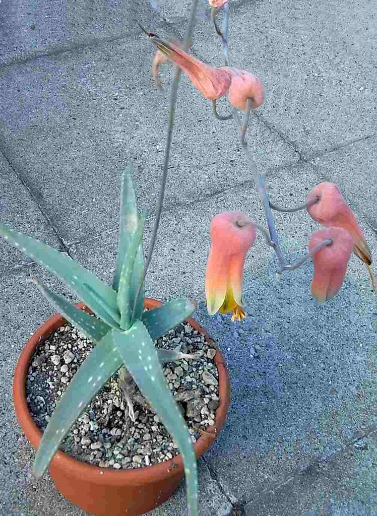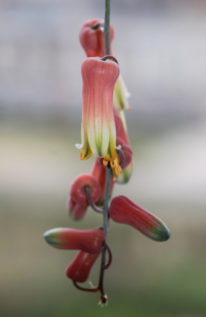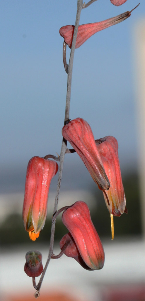 花朵管状,长约 20 mm,颜色通常橙色至粉红色,与绿色或灰绿色相间的外花被片尖端对比明显。