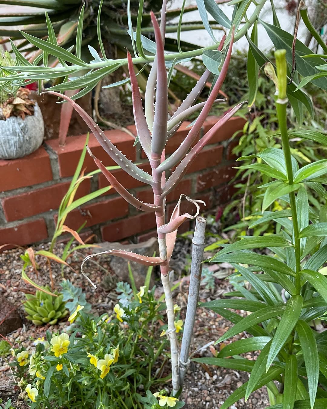 稀疏排列的披针形叶片,灰绿色并带浅斑。