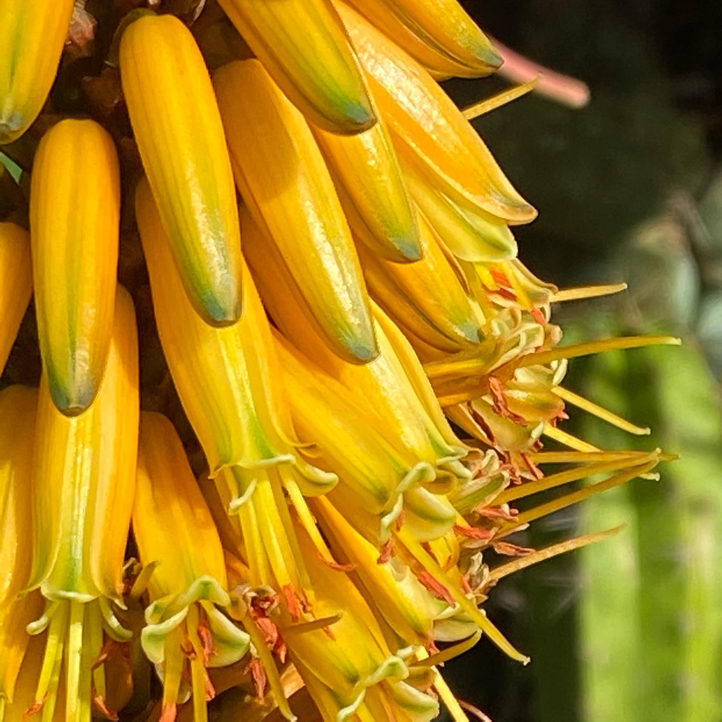 花序上部具密集圆柱状簇生花,花色为鲜亮黄色,呈钟状短花序,花苞与外花被片上部未完全融合。